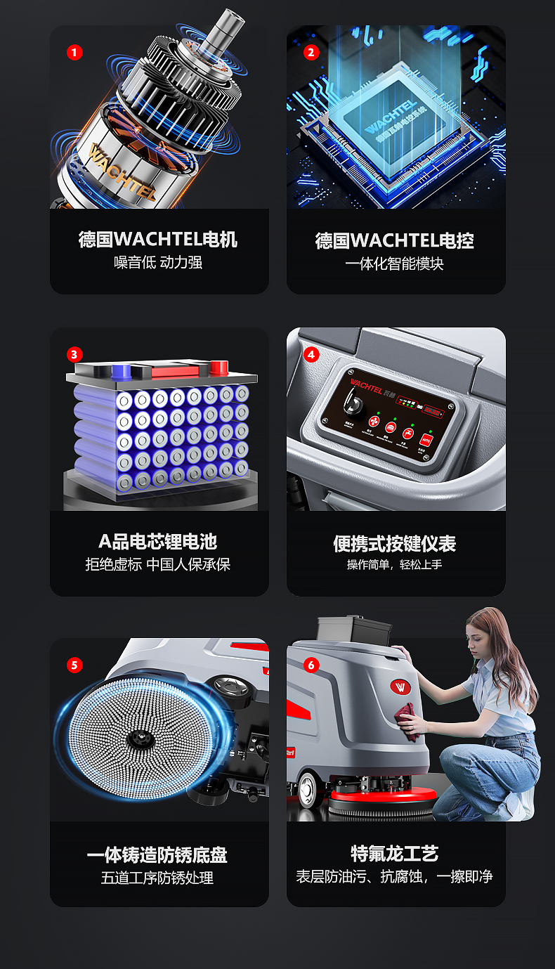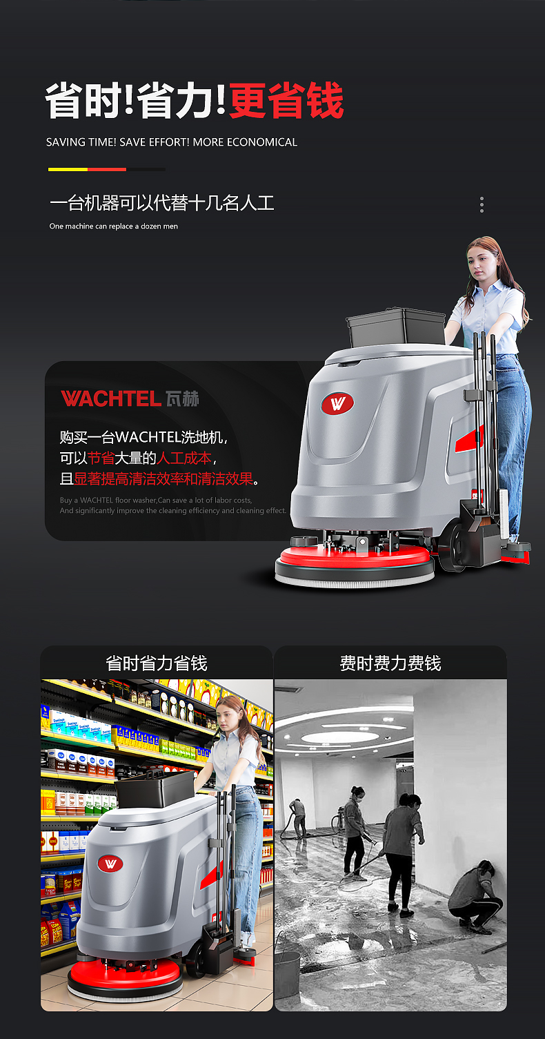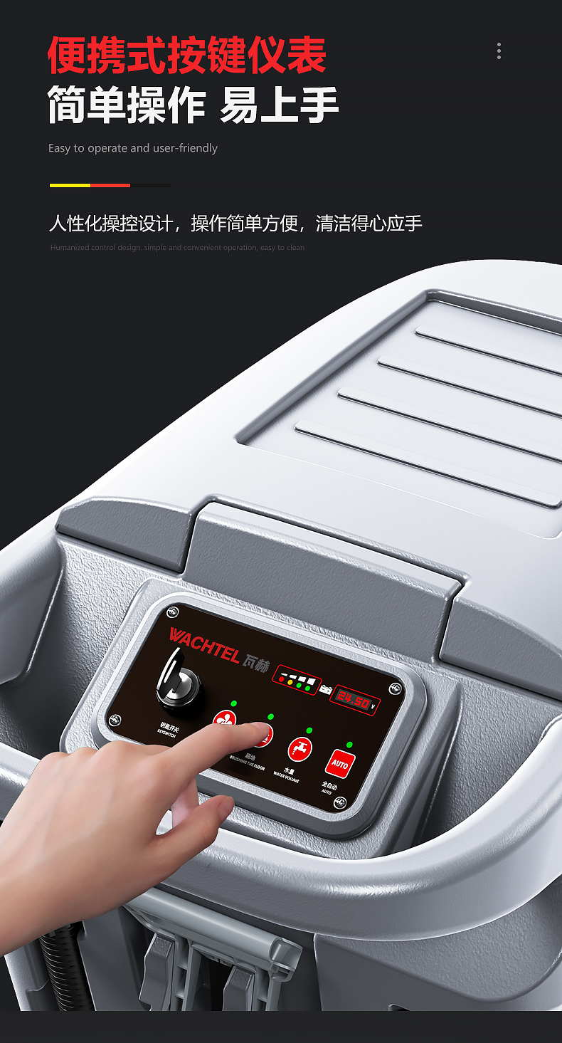 品牌:WACHTEL 名稱:多功能商用手推式洗地機 型號: SX530 清掃寬度:530 mm 清潔效率:2600m²/h 工作時間:3~4h 水箱容量:71L/65L(清/污) 電池:意大利OM鋰電 電機::德國瓦赫電機 整機重量:102kg 產品尺寸:1110*830*1000mm 適用清潔場所: 商場 超市 車庫 車間 辦公樓等