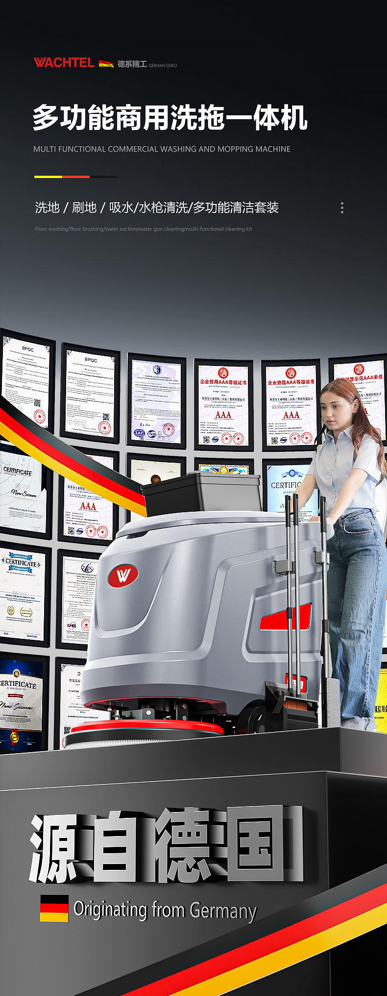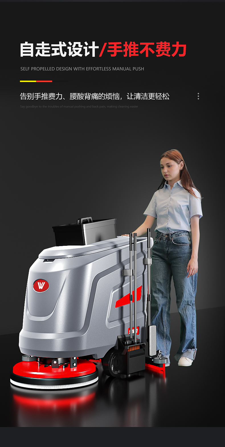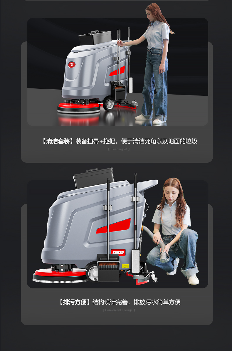品牌:WACHTEL 名稱:多功能商用手推式洗地機 型號: SX530 清掃寬度:530 mm 清潔效率:2600m²/h 工作時間:3~4h 水箱容量:71L/65L(清/污) 電池:意大利OM鋰電 電機::德國瓦赫電機 整機重量:102kg 產品尺寸:1110*830*1000mm 適用清潔場所: 商場 超市 車庫 車間 辦公樓等